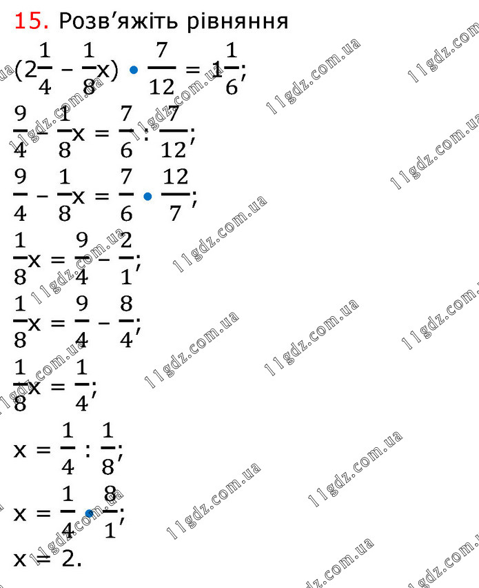 Розв’яжіть рівняння (21/4 – 1/8х) • 7/12 = 11/6; 9/4 – 1/8х = 7/6 : 7/12; 9/4 – 1/8х = 7/6 • 12/7; 1/8х = 9/4 – 2/1; 1/8х = 9/4 – 8/4; 1/8х = 1/4; х = 1/4 : 1/8; х = 1/4 • 8/1; х = 2.