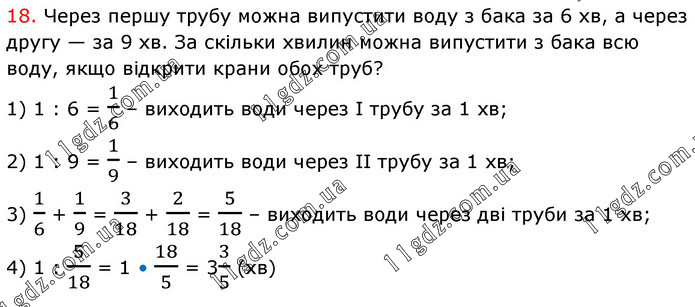 Через першу трубу можна випустити воду з бака за 6 хв, а через другу — за 9 хв. За скільки хвилин можна випустити з бака всю воду, якщо відкрити крани обох труб? 1) 1 : 6 = 1/6 – виходить води через І трубу за 1 хв; 2) 1 : 9 = 1/9 – виходить води через ІІ трубу за 1 хв; 3) 1/6 + 1/9 = 3/18 + 2/18 = 5/18 – виходить води через дві труби за 1 хв; 4) 1 : 5/18 = 1 • 18/5 = 33/5 (хв)