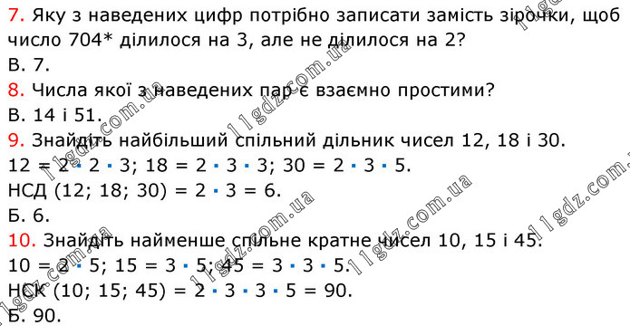 7. Яку з наведених цифр потрібно записати замість зірочки, щоб число 704* ділилося на 3, але не ділилося на 2? В. 7. 8. Числа якої з наведених пар є взаємно простими? В. 14 і 51. 9. Знайдіть найбільший спільний дільник чисел 12, 18 і 30. 12 = 2 · 2 · 3; 18 = 2 · 3 · 3; 30 = 2 · 3 · 5. НСД (12; 18; 30) = 2 · 3 = 6. Б. 6. 10. Знайдіть найменше спільне кратне чисел 10, 15 і 45. 10 = 2 · 5; 15 = 3 · 5; 45 = 3 · 3 · 5. НСК (10; 15; 45) = 2 · 3 · 3 · 5 = 90. Б. 90.