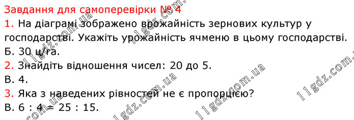 Завдання для самоперевірки № 4 1. На діаграмі зображено врожайність зернових культур у господарстві. Укажіть урожайність ячменю в цьому господарстві. Б. 30 ц/га. 2. Знайдіть відношення чисел: 20 до 5. В. 4. 3. Яка з наведених рівностей не є пропорцією? В. 6 : 4 = 25 : 15.