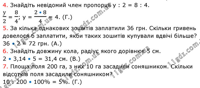 4. Знайдіть невідомий член пропорції у : 2 = 8 : 4. у/2 = 8/4; у = (2 • 8)/4 = 4. (Г.) 5. За кілька однакових зошитів заплатили 36 грн. Скільки гривень довелося б заплатити, якби таких зошитів купували вдвічі більше? 36 • 2 = 72 грн. (А.) 6. Знайдіть довжину кола, радіус якого дорівнює 5 см. 2 • 3,14 • 5 = 31,4 см. (В.) 7. Площа поля 200 га, з них 10 га засадили соняшником. Скільки відсотків поля засадили соняшником? 10 : 200 • 100% = 5%. (Г.)