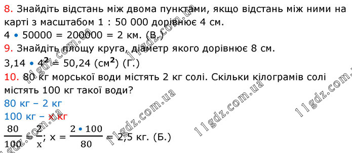 8. Знайдіть відстань між двома пунктами, якщо відстань між ними на карті з масштабом 1 : 50 000 дорівнює 4 см. 4 • 50000 = 200000 = 2 км. (В.) 9. Знайдіть площу круга, діаметр якого дорівнює 8 см. 3,14 • 42 = 50,24 (см2) (Г.) 10. 80 кг морської води містять 2 кг солі. Скільки кілограмів солі містять 100 кг такої води? 80 кг – 2 кг 100 кг – х кг 80/100 = 2/х; х = (2 • 100)/80 = 2,5 кг. (Б.)