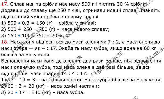 17. Сплав міді та срібла має масу 500 г і містить 30 % срібла. Додавши до сплаву ще 250 г міді, отримали новий сплав. Знайдіть відсотковий уміст срібла в новому сплаві. 1) 500 • 0,3 = 150 (г) – срібла у сплаві; 2) 500 + 250 = 750 (г) – маса нового сплаву; 3) 150 • 100 : 750 = 20% 18. Маса коня відноситься до маси оленя як 7 : 2, а маса оленя до маси зубра — як 4 : 17. Знайдіть масу зубра, якщо вона на 60 кг більша за масу коня. Відношення маси коня до оленя в два рази менше, ніж відношення маси оленя до зубра, тоді маса оленя в два разі більше, звідси відношення маси тварин 14 : 4 : 17. 1) 17 – 14 = 3 – на стільки частин маса зубра більше за масу коня; 2) 60 : 3 = 20 (кг) – маса однієї частини; 3) 20 • 17 = 340 (кг) – маса зубра.