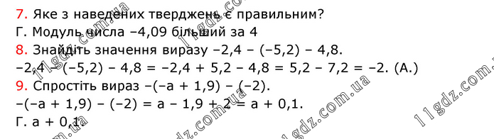 7. Яке з наведених тверджень є правильним? Г. Модуль числа –4,09 більший за 4 8. Знайдіть значення виразу –2,4 – (–5,2) – 4,8. –2,4 – (–5,2) – 4,8 = –2,4 + 5,2 – 4,8 = 5,2 – 7,2 = –2. (А.) 9. Спростіть вираз –(–а + 1,9) – (–2). –(–а + 1,9) – (–2) = а – 1,9 + 2 = а + 0,1. Г. а + 0,1.
