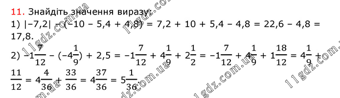 11. Знайдіть значення виразу: 1) |–7,2| – (–10 – 5,4 + 4,8) = 7,2 + 10 + 5,4 – 4,8 = 22,6 – 4,8 = 17,8. 2) –17/12 – (–41/9) + 2,5 = –17/12 + 41/9 + 21/2 = –17/12 + 41/9 + 118/12 = 41/9 + 11/12 = 44/36 + 33/36 = 437/36 = 51/36.