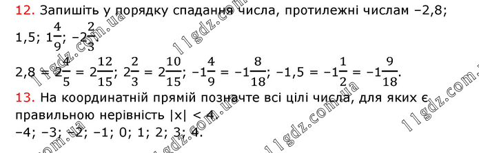 12. Запишіть у порядку спадання числа, протилежні числам –2,8; 1,5; 14/9; –22/3. 2,8 = 24/5 = 212/15; 22/3 = 210/15; –14/9 = –18/18; –1,5 = –11/2 = –19/18. 13. На координатній прямій позначте всі цілі числа, для яких є правильною нерівність |х| < 4. –4; –3; –2; –1; 0; 1; 2; 3; 4.