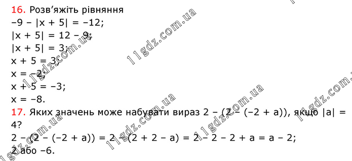 16. Розв’яжіть рівняння –9 – |x + 5| = –12; |x + 5| = 12 – 9; |x + 5| = 3; x + 5 = 3; x = –2; x + 5 = –3; x = –8. 17. Яких значень може набувати вираз 2 – (2 – (–2 + а)), якщо |a| = 4? 2 – (2 – (–2 + а)) = 2 – (2 + 2 – а) = 2 – 2 – 2 + а = а – 2; 2 або –6.