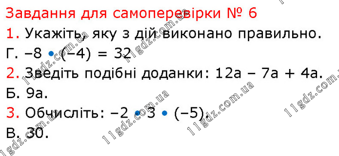 Завдання для самоперевірки № 6 1. Укажіть, яку з дій виконано правильно. Г. –8 • (–4) = 32 2. Зведіть подібні доданки: 12а – 7а + 4а. Б. 9а. 3. Обчисліть: –2 • 3 • (–5). В. 30.