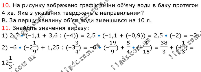 10. На рисунку зображено графік зміни об’єму води в баку протягом 4 хв. Яке з указаних тверджень є неправильним? В. За першу хвилину об’єм води зменшився на 10 л. 11. Знайдіть значення виразу: 1) 2,5 • (–1,1 + 3,6 : (–4)) = 2,5 • (–1,1 + (–0,9)) = 2,5 • (–2) = –5; 2) –6 • (–21/9) + 1,25 : (–33/4) = –6 • (–19/9) + 5/4 • (–4/15) = 38/3 + (–1/3) = 121/3.