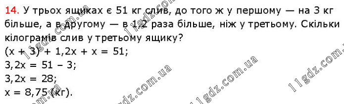 У трьох ящиках є 51 кг слив, до того ж у першому — на З кг більше, а в другому — в 1,2 раза більше, ніж у третьому. Скільки кілограмів слив у третьому ящику? (х + 3) + 1,2х + х = 51; 3,2х = 51 – 3; 3,2х = 28; х = 8,75 (кг).