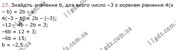 17. Знайдіть значення b, для якого число –3 є коренем рівняння 4(х – b) = 2b – х. 4(–3 – b) = 2b – (–3); –12 – 4b – 2b = 3; –6b = 12 + 3; –6b = 15; b = –2,5.