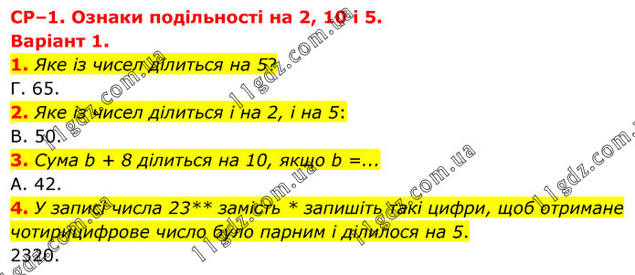 СР–1. Ознаки подільності на 2, 10 і 5. Варіант 1. 1. Яке із чисел ділиться на 5? Г. 65. 2. Яке із чисел ділиться і на 2, і на 5: В. 50. 3. Сума b + 8 ділиться на 10, якщо b =... А. 42. 4. У записі числа 23** замість * запишіть такі цифри, щоб отримане чотирицифрове число було парним і ділилося на 5. 2320.