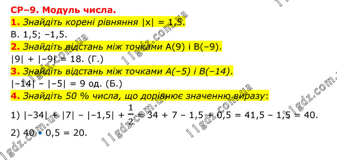 СР–9. Модуль числа. 1. Знайдіть корені рівняння |х| = 1,5. В. 1,5; –1,5. 2. Знайдіть відстань між точками А(9) і В(–9). |9| + |–9| = 18. (Г.) 3. Знайдіть відстань між точками А(–5) і В(–14). |–14| – |–5| = 9 од. (Б.) 4. Знайдіть 50 % числа, що дорівнює значенню виразу: 1) |–34| + |7| – |–1,5| + 1/2 = 34 + 7 – 1,5 + 0,5 = 41,5 – 1,5 = 40. 2) 40 • 0,5 = 20.