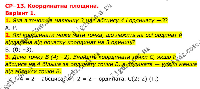СР–13. Координатна площина. Варіант 1. 1. Яка з точок на малюнку 3 має абсцису 4 і ординату —З? А. Р. 2. Які координати може мати точка, що лежить на осі ординат й віддалена від початку координат на 3 одиниці? Б. (0; –3). 3. Дано точку В (4; –2). Знайдіть координати точки С, якщо її абсциса на 4 більша за ординату точки В, а ордината — удвічі менша від абсциси точки В. –2 + 4 = 2 – абсциса; 4 : 2 = 2 – ордината. С(2; 2) (Г.)