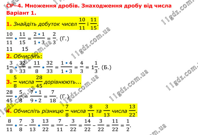 СР–4. Множення дробів. Знаходження дробу від числа Варіант 1. 1. Знайдіть добуток чисел 10/11 і 11/15. 10/11 • 11/15 = (2 • 1)/(1 • 3) = 2/3. (Г.) 11 15 2. Обчисліть: 13/8 • 32/33 = 11/8 • 32/33 = (1 • 4)/(1 • 3) = 4/3 = 11/3. (Б.) 3. 5/8 числа 28/45 дорівнюють... 28/45 • 5/8 = (7 • 1)/(9 • 2) = 7/18. (Г.) 4. Обчисліть різницю 7/8 числа 8/11 та 3/13 числа 13/22. 8/11 • 7/8 – 3/13 • 13/22 = 7/11 – 3/22 = 14/22 – 3/22 = 11/22 = 1/2.