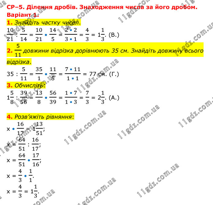СР–5. Ділення дробів. Знаходження числа за його дробом. Варіант 1. 1. Знайдіть частку чисел. 10/21 : 5/14 = 10/21 • 14/5 = (2 • 2)/(3 • 1) = 4/3 = 11/3. (В.) 2. 5/11 довжини відрізка дорівнюють 35 см. Знайдіть довжину всього відрізка. 35 : 5/11 = 35/1 • 11/5 = (7 • 11)/(1 • 1) = 77 см. (Г.) 3. Обчисліть: 15/8 : 39/56 = 13/8 • 56/39 = (1 • 7)/(1 • 3) = 7/3 = 21/3. (А.) 4. Розв’яжіть рівняння: х • 16/17 = 113/51; х = 64/51 : 16/17; х = 64/51 • 17/16; х = 4/3 • 1/1. х = 4/3 = 11/3.