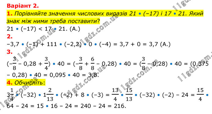Варіант 2. 1. Порівняйте значення числових виразів 21 • (–17) і 17 • 21. Який знак між ними треба поставити? 21 • (–17) < 17 • 21. (А.) 2. –3,7 • (–1) + 111 • (–2,2) • 0 • (–4) = 3,7 + 0 = 3,7 (А.) 3. (–3/8 – 0,28 + 3/4) • 40 = (–3/8 + 6/8 – 0,28) • 40 = (3/8 – 0,28) • 40 = (0,375 – 0,28) • 40 = 0,095 • 40 = 3,8. 4. Обчисліть: 31/4 • (–32) • 12/13 • (–2) + 8 • (–3) = 13/4 • 15/13 • (–32) • (–2) – 24 = 15/4 • 64 – 24 = 15 • 16 – 24 = 240 – 24 = 216.