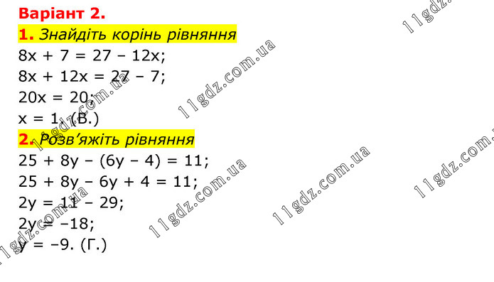 Варіант 2. 1. Знайдіть корінь рівняння 8х + 7 = 27 – 12х; 8х + 12х = 27 – 7; 20х = 20; х = 1. (В.) 2. Pозв’яжіть рівняння 25 + 8у – (6у – 4) = 11; 25 + 8у – 6у + 4 = 11; 2у = 11 – 29; 2у = –18; у = –9. (Г.)