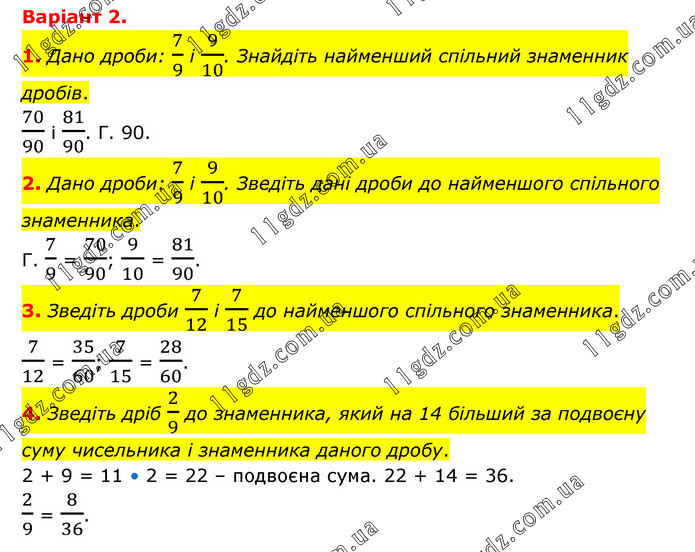 Варіант 2. 1. Дано дроби: 7/9 і 9/10. Знайдіть найменший спільний знаменник дробів. 70/90 і 81/90. Г. 90. 2. Дано дроби: 7/9 і 9/10. Зведіть дані дроби до найменшого спільного знаменника. Г. 7/9 = 70/90; 9/10 = 81/90. 3. Зведіть дроби 7/12 і 7/15 до найменшого спільного знаменника. 7/12 = 35/60; 7/15 = 28/60. 4. Зведіть дріб 2/9 до знаменника, який на 14 більший за подвоєну суму чисельника і знаменника даного дробу. 2 + 9 = 11 • 2 = 22 – подвоєна сума. 22 + 14 = 36. 2/9 = 8/36.