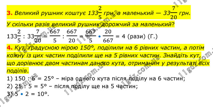 3. Великий рушник коштує 1332/5 грн, а маленький — 337/20 грн. У скільки разів великий рушник дорожчий за маленький? 1332/5 : 337/20 = 667/5 : 667/20 = 667/5 • 20/667 = 4 (рази) (Г.) 4. Кут, градусною мірою 150°, поділили на 6 рівних частин, а потім кожну із цих частин поділили ще на 5 рівних частин. Знайдіть кут, що дорівнює двом частинам даного кута, отриманим у результаті всіх поділів. 1) 150 : 6 = 25° – міра одного кута після поділу на 6 частин; 2) 25 : 5 = 5° – після поділу ще на 5 частин; 3) 5 • 2 = 10°.