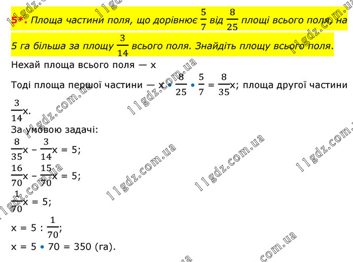 Площа частини поля, що дорівнює 5/7 від 8/25 площі всього поля, на 5 га більша за площу 3/14 всього поля. Знайдіть площу всього поля. Нехай площа всього поля — х Тоді площа першої частини — х • 8/25 • 5/7 = 8/35х; площа другої частини 3/14х. За умовою задачі: 8/35х – 3/14х = 5; 16/70х – 15/70х = 5; 1/70х = 5; х = 5 : 1/70; х = 5 • 70 = 350 (га).