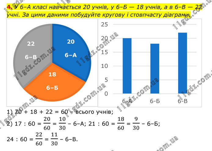 У 6–А класі навчається 20 учнів, у 6–Б — 18 учнів, а в 6–В — 22 учні. За цими даними побудуйте кругову і стовпчасту діаграми. 1) 20 + 18 + 22 = 60 – всього учнів; 2) 17 : 60 = 20/60 = 10/30 – 6–А; 21 : 60 = 18/60 = 9/30 – 6–Б; 24 : 60 = 22/60 = 11/30 – 6–В.