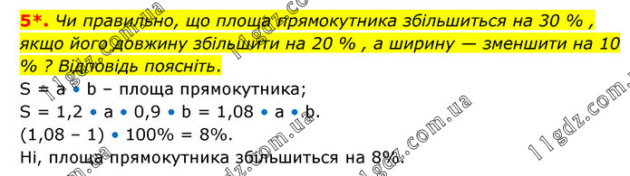 Чи правильно, що площа прямокутника збільшиться на 30 % , якщо його довжину збільшити на 20 % , а ширину — зменшити на 10 % ? Відповідь поясніть. S = a • b – площа прямокутника; S = 1,2 • a • 0,9 • b = 1,08 • a • b. (1,08 – 1) • 100% = 8%. Ні, площа прямокутника збільшиться на 8%.