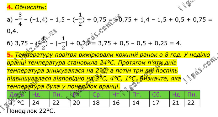 4. Обчисліть: а) –3/4 – (–1,4) – 1,5 – (–1/2) + 0,75 = –0,75 + 1,4 – 1,5 + 0,5 + 0,75 = 0,4. б) 3,75 – (–1/2) – |–1/2| + 0,25 = 3,75 + 0,5 – 0,5 + 0,25 = 4. 5. Температуру повітря вимірювали кожний ранок о 8 год. У неділю вранці температура становила 24°С. Протягом п’яти днів температура знижувалася на 2°С, а потім три дні поспіль підвищувалася відповідно на 3°С, 4°С, 1°C. Визначте, яка температура була у понеділок вранці. Понеділок 22°С.