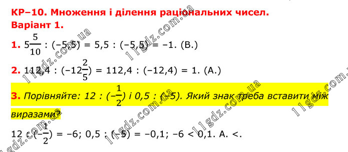 КР–10. Множення і ділення раціональних чисел. Варіант 1. 1. 55/10 : (–5,5) = 5,5 : (–5,5) = –1. (В.) 2. 112,4 : (–122/5) = 112,4 : (–12,4) = 1. (А.) 3. Порівняйте: 12 : (–1/2) і 0,5 : (–5). Який знак треба вставити між виразами? 12 : (–1/2) = –6; 0,5 : (–5) = –0,1; –6 < 0,1. А. <.