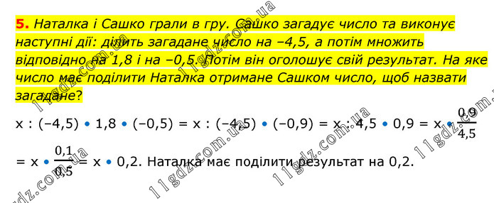 Наталка і Сашко грали в гру. Сашко загадує число та виконує наступні дії: ділить загадане число на –4,5, а потім множить відповідно на 1,8 і на –0,5. Потім він оголошує свій результат. На яке число має поділити Наталка отримане Сашком число, щоб назвати загадане? х : (–4,5) • 1,8 • (–0,5) = х : (–4,5) • (–0,9) = х : 4,5 • 0,9 = х • 0,9/4,5 = х • 0,1/0,5 = х • 0,2. Наталка має поділити результат на 0,2.