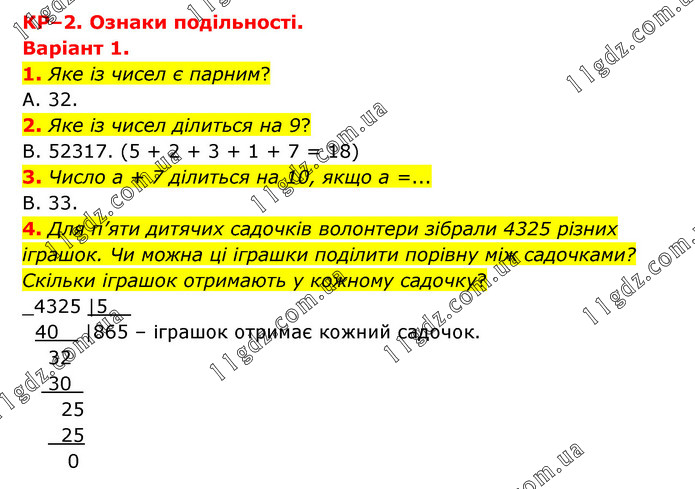 КР–2. Ознаки подільності. Варіант 1. 1. Яке із чисел є парним? А. 32. 2. Яке із чисел ділиться на 9? В. 52317. (5 + 2 + 3 + 1 + 7 = 18) 3. Число а + 7 ділиться на 10, якщо а =... В. 33. 4. Для п’яти дитячих садочків волонтери зібрали 4325 різних іграшок. Чи можна ці іграшки поділити порівну між садочками? Скільки іграшок отримають у кожному садочку?