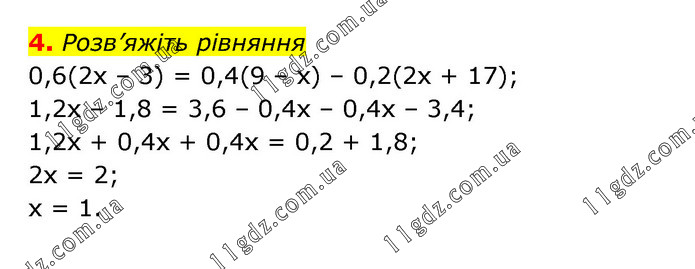Розв’яжіть рівняння 0,6(2х – 3) = 0,4(9 – х) – 0,2(2х + 17); 1,2х – 1,8 = 3,6 – 0,4х – 0,4х – 3,4; 1,2х + 0,4х + 0,4х = 0,2 + 1,8; 2х = 2; х = 1.