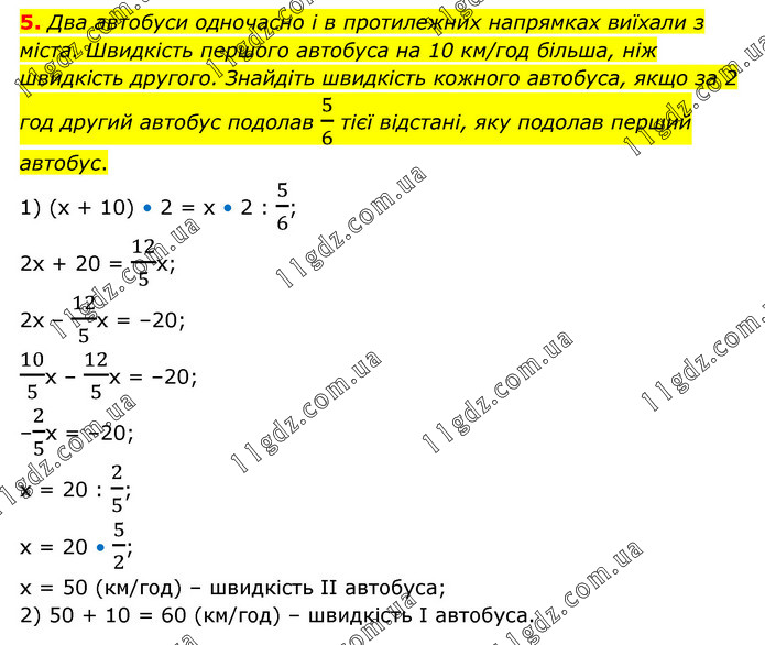 Два автобуси одночасно і в протилежних напрямках виїхали з міста. Швидкість першого автобуса на 10 км/год більша, ніж швидкість другого. Знайдіть швидкість кожного автобуса, якщо за 2 год другий автобус подолав 5/6 тієї відстані, яку подолав перший автобус. 1) (х + 10) • 2 = х • 2 : 5/6; 2х + 20 = 12/5х; 2х – 12/5х = –20; 10/5х – 12/5х = –20; –2/5х = –20; х = 20 : 2/5; х = 20 • 5/2; х = 50 (км/год) – швидкість ІІ автобуса; 2) 50 + 10 = 60 (км/год) – швидкість І автобуса.