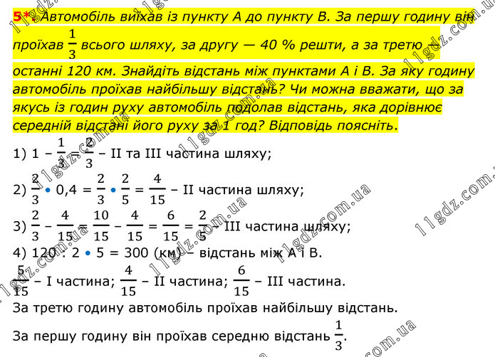 Автомобіль виїхав із пункту А до пункту В. За першу годину він проїхав 1/3 всього шляху, за другу — 40 % решти, а за третю — останні 120 км. Знайдіть відстань між пунктами A i В. За яку годину автомобіль проїхав найбільшу відстань? Чи можна вважати, що за якусь із годин руху автомобіль подолав відстань, яка дорівнює середній відстані його руху за 1 год? Відповідь поясніть. 1) 1 – 1/3 = 2/3 – ІІ та ІІІ частина шляху; 2) 2/3 • 0,4 = 2/3 • 2/5 = 4/15 – ІІ частина шляху; 3) 2/3 – 4/15 = 10/15 – 4/15 = 6/15 = 2/5 – ІІІ частина шляху; 4) 120 : 2 • 5 = 300 (км) – відстань між А і В. 5/15 – І частина; 4/15 – ІІ частина; 6/15 – ІІІ частина. За третю годину автомобіль проїхав найбільшу відстань. За першу годину він проїхав середню відстань 1/3.