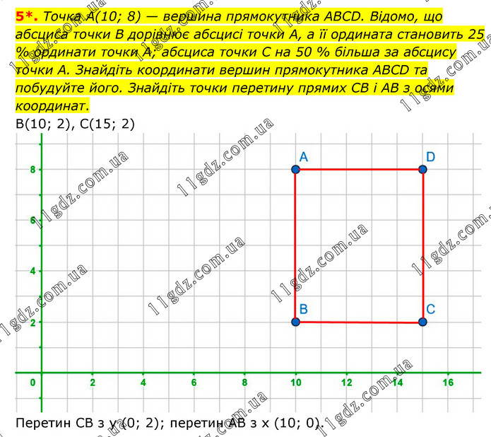 Точка А(10; 8) — вершина прямокутника ABCD. Відомо, що абсциса точки В дорівнює абсцисі точки А, а її ордината становить 25 % ординати точки А; абсциса точки C на 50 % більша за абсцису точки А. Знайдіть координати вершин прямокутника ABCD та побудуйте його. Знайдіть точки перетину прямих CB і AB з осями координат. В(10; 2), С(15; 2) Перетин СВ з у (0; 2); перетин АВ з х (10; 0).
