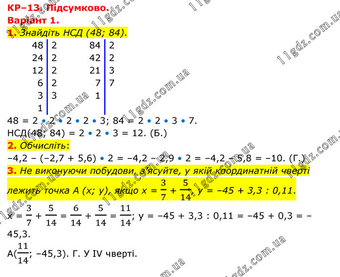 КР–13. Підсумково. Варіант 1. 1. Знайдіть НСД (48; 84). 48 = 2 • 2 • 2 • 2 • 3; 84 = 2 • 2 • 3 • 7. НСД(48; 84) = 2 • 2 • 3 = 12. (Б.) 2. Обчисліть: –4,2 – (–2,7 + 5,6) • 2 = –4,2 – 2,9 • 2 = –4,2 – 5,8 = –10. (Г.) 3. He виконуючи побудови, з’ясуйте, у якій координатній чверті лежить точка А (х; у), якщо х = 3/7 + 5/14, у = –45 + 3,3 : 0,11. х = 3/7 + 5/14 = 6/14 + 5/14 = 11/14; у = –45 + 3,3 : 0,11 = –45 + 0,3 = –45,3. А(11/14; –45,3). Г. У IV чверті.