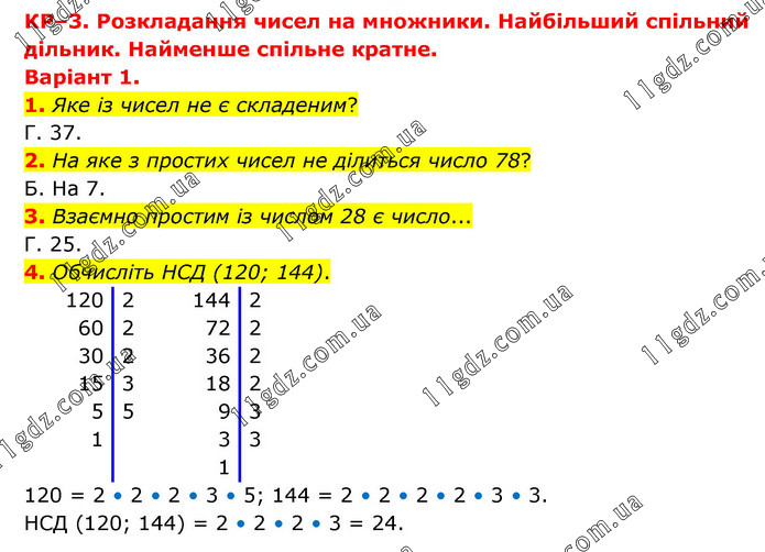 КР–3. Розкладання чисел на множники. Найбільший спільний дільник. Найменше спільне кратне. Варіант 1. 1. Яке із чисел не є складеним? Г. 37. 2. На яке з простих чисел не ділиться число 78? Б. На 7. 3. Взаємно простим із числом 28 є число... Г. 25. 4. Обчисліть НСД (120; 144). 120 = 2 • 2 • 2 • 3 • 5; 144 = 2 • 2 • 2 • 2 • 3 • 3. НСД (120; 144) = 2 • 2 • 2 • 3 = 24.