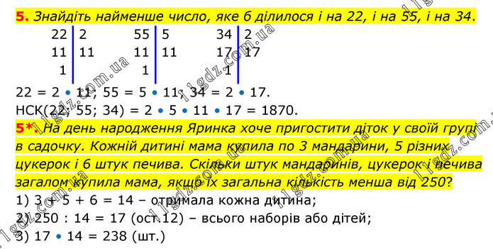 5. Знайдіть найменше число, яке б ділилося і на 22, і на 55, і на 34. 22 = 2 • 11; 55 = 5 • 11; 34 = 2 • 17. НСК(22; 55; 34) = 2 • 5 • 11 • 17 = 1870. 5*. На день народження Яринка хоче пригостити діток у своїй групі в садочку. Кожній дитині мама купила по 3 мандарини, 5 різних цукерок і 6 штук печива. Скільки штук мандаринів, цукерок і печива загалом купила мама, якщо їх загальна кількість менша від 250? 1) 3 + 5 + 6 = 14 – отримала кожна дитина; 2) 250 : 14 = 17 (ост.12) – всього наборів або дітей; 3) 17 • 14 = 238 (шт.)