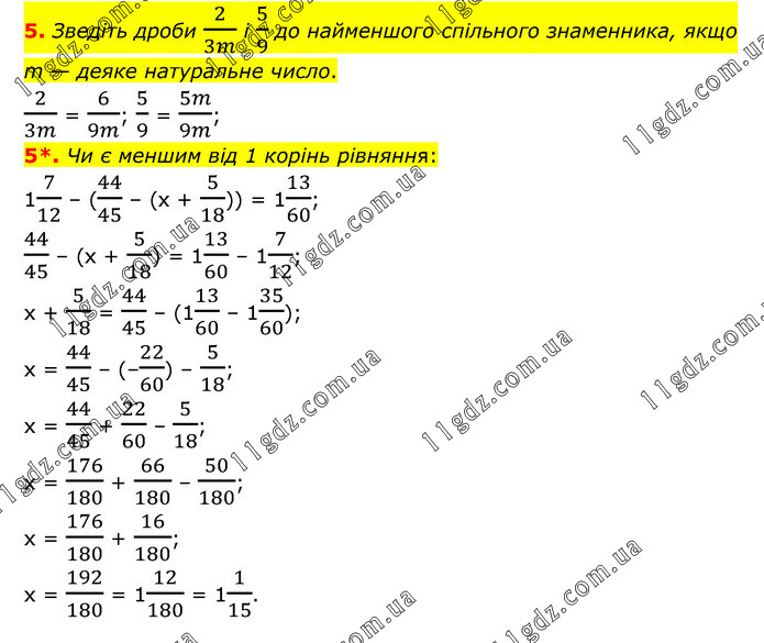 5. Зведіть дроби 2/3m і 5/9 до найменшого спільного знаменника, якщо m — деяке натуральне число. 2/3m = 6/9m; 5/9 = 5m/9m; 5*. Чи є меншим від 1 корінь рівняння: 17/12 – (44/45 – (х + 5/18)) = 113/60; 44/45 – (х + 5/18) = 113/60 – 17/12; х + 5/18 = 44/45 – (113/60 – 135/60); х = 44/45 – (–22/60) – 5/18; х = 44/45 + 22/60 – 5/18; х = 176/180 + 66/180 – 50/180; х = 176/180 + 16/180; х = 192/180 = 112/180 = 11/15.