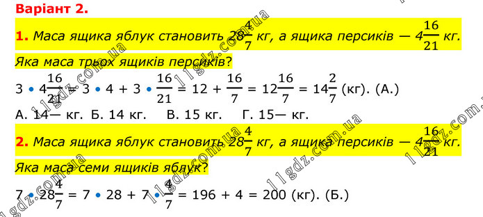 Варіант 2. 1. Маса ящика яблук становить 284/7 кг, а ящика персиків — 416/21 кг. Яка маса трьох ящиків персиків? 3 • 416/21 = 3 • 4 + 3 • 16/21 = 12 + 16/7 = 1216/7 = 142/7 (кг). (А.) А. 14— кг. Б. 14 кг. В. 15 кг. Г. 15— кг. 2. Маса ящика яблук становить 284/7 кг, а ящика персиків — 416/21 кг. Яка маса семи ящиків яблук? 7 • 284/7 = 7 • 28 + 7 • 4/7 = 196 + 4 = 200 (кг). (Б.)