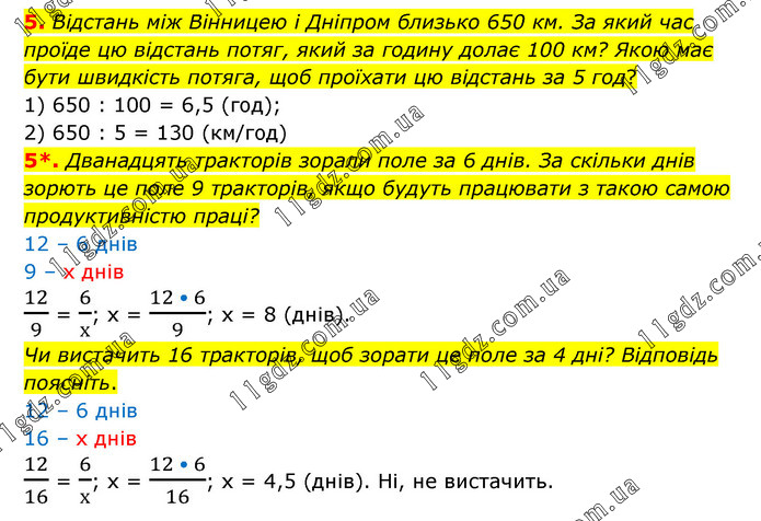 5. Відстань між Вінницею і Дніпром близько 650 км. За який час проїде цю відстань потяг, який за годину долає 100 км? Якою має бути швидкість потяга, щоб проїхати цю відстань за 5 год? 1) 650 : 100 = 6,5 (год); 2) 650 : 5 = 130 (км/год) 5*. Дванадцять тракторів зорали поле за 6 днів. За скільки днів зорють це поле 9 тракторів, якщо будуть працювати з такою самою продуктивністю праці? 12 – 6 днів 9 – х днів 12/9 = 6/х; х = (12 • 6)/9; х = 8 (днів). Чи вистачить 16 тракторів, щоб зорати це поле за 4 дні? Відповідь поясніть. 12 – 6 днів 16 – х днів 12/16 = 6/х; х = (12 • 6)/16; х = 4,5 (днів). Ні, не вистачить.