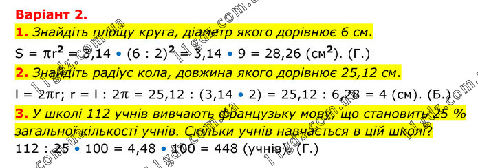 Варіант 2. 1. Знайдіть площу круга, діаметр якого дорівнює 6 см. S = r2 = 3,14 • (6 : 2)2 = 3,14 • 9 = 28,26 (см2). (Г.) 2. Знайдіть радіус кола, довжина якого дорівнює 25,12 см. l = 2r; r = l : 2 = 25,12 : (3,14 • 2) = 25,12 : 6,28 = 4 (см). (Б.) 3. У школі 112 учнів вивчають французьку мову, що становить 25 % загальної кількості учнів. Скільки учнів навчається в цій школі? 112 : 25 • 100 = 4,48 • 100 = 448 (учнів). (Г.)