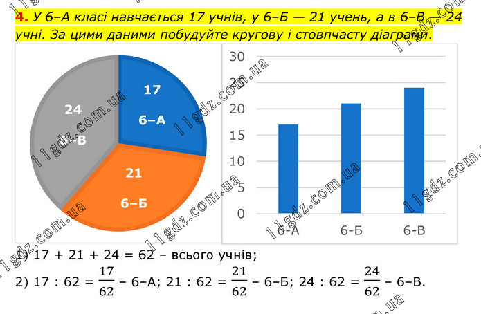 У 6–А класі навчається 17 учнів, у 6–Б — 21 учень, а в 6–В — 24 учні. За цими даними побудуйте кругову і стовпчасту діаграми. 1) 17 + 21 + 24 = 62 – всього учнів; 2) 17 : 62 = 17/62 – 6–А; 21 : 62 = 21/62 – 6–Б; 24 : 62 = 24/62 – 6–В.