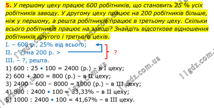 У першому цеху працює 600 робітників, що становить 25 % усіх робітників заводу. У другому цеху працює на 200 робітників більше, ніж у першому, а решта робітників працює в третьому цеху. Скільки всього робітників працює на заводі? Знайдіть відсоткове відношення робітників другого і третього цехів. І. – 600 р., 25% від всього; ІІ. – ?, на 200 р. > ? ІІІ. – ?, решта. 1) 600 : 25 • 100 = 2400 (р.) – в І цеху; 2) 600 + 200 = 800 (р.) – в ІІ цеху; 3) 2400 – 600 – 8000 = 1000 (р.) – в ІІІ цеху; 4) 800 : 2400 • 100 = 33,33% – в ІІ цеху; 5) 1000 : 2400 • 100 = 41,67% – в ІІІ цеху.