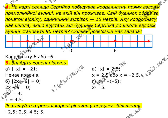 На карті селища Сергійко побудував координатну пряму вздовж прямолінійної вулиці, на якій він проживає. Свій будинок обрав за початок відліку, одиничний відрізок — 15 метрів. Яку координату має школа, якщо відстань від будинку Сергійка до школи вздовж вулиці становить 90 метрів? Скільки розв’язків має задача? Координату 6 або –6. 5. Знайдіть корені рівнянь: а) |–х| = –21; Немає коренів. б) |2х – 9| = 0; 2х – 9 = 0; 2х = 9; х = 4,5. в) |х| = 2,5; х = 2,5 або х = –2,5. г) х = –(–5); х = 5. Розташуйте отримані корені рівнянь у порядку збільшення. –2,5; 2,5; 4,5; 5.