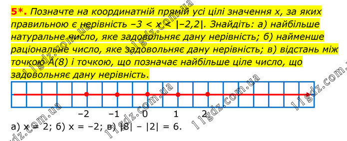 Позначте на координатній прямій усі цілі значення х, за яких правильною є нерівність –3 < х < |–2,2|. Знайдіть: а) найбільше натуральне число, яке задовольняє дану нерівність; б) найменше раціональне число, яке задовольняє дану нерівність; в) відстань між точкою А(8) і точкою, що позначає найбільше ціле число, що задовольняє дану нерівність. а) х = 2; б) х = –2; в) |8| – |2| = 6.