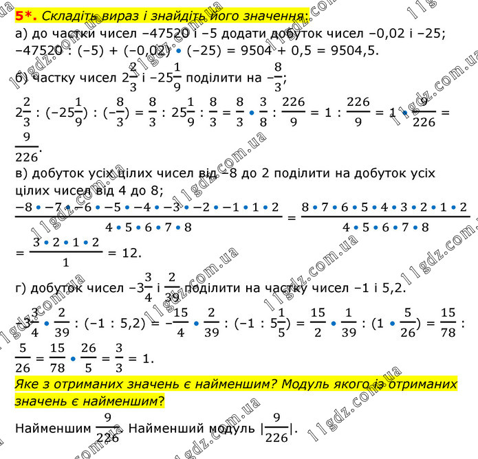 Складіть вираз і знайдіть його значення: а) до частки чисел –47520 і –5 додати добуток чисел –0,02 і –25; –47520 : (–5) + (–0,02) • (–25) = 9504 + 0,5 = 9504,5. б) частку чисел 22/3 і –251/9 поділити на –8/3; 22/3 : (–251/9) : (–8/3) = 8/3 : 251/9 : 8/3 = 8/3 • 3/8 : 226/9 = 1 : 226/9 = 1 • 9/226 = 9/226. в) добуток усіх цілих чисел від –8 до 2 поділити на добуток усіх цілих чисел від 4 до 8; (-8 • -7 • -6 • -5 • -4 • -3 • -2 • -1 • 1 • 2 )/(4 • 5 • 6 • 7 • 8) = (8 • 7 • 6 • 5 • 4 • 3 • 2 • 1 • 2 )/(4 • 5 • 6 • 7 • 8) = ( 3 • 2 • 1 • 2 )/1 = 12. г) добуток чисел –33/4 і 2/39 поділити на частку чисел –1 і 5,2. –33/4 • 2/39 : (–1 : 5,2) = –15/4 • 2/39 : (–1 : 51/5) = 15/2 • 1/39 : (1 • 5/26) = 15/78 : 5/26 = 15/78 • 26/5 = 3/3 = 1. Яке з отриманих значень є найменшим? Модуль якого із отриманих значень є найменшим? Найменшим 9/226. Найменший модуль |9/226|.