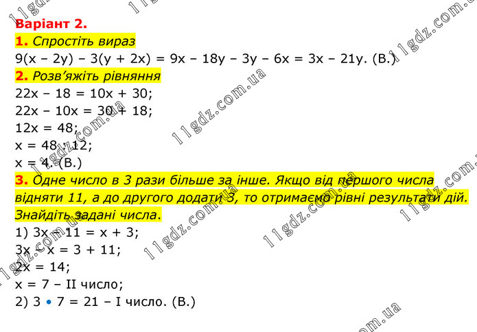 Варіант 2. 1. Спростіть вираз 9(х – 2у) – 3(у + 2х) = 9х – 18у – 3у – 6х = 3х – 21у. (В.) 2. Розв’яжіть рівняння 22х – 18 = 10x + 30; 22х – 10х = 30 + 18; 12х = 48; х = 48 : 12; х = 4. (В.) 3. Одне число в 3 рази більше за інше. Якщо від першого числа відняти 11, а до другого додати 3, то отримаємо рівні результати дій. Знайдіть задані числа. 1) 3х – 11 = х + 3; 3х – х = 3 + 11; 2х = 14; х = 7 – ІІ число; 2) 3 • 7 = 21 – І число. (В.)
