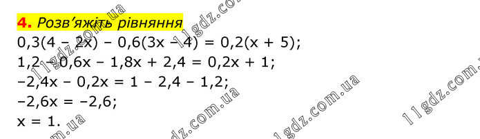 Розв’яжіть рівняння 0,3(4 – 2х) – 0,6(3х – 4) = 0,2(х + 5); 1,2 – 0,6х – 1,8х + 2,4 = 0,2х + 1; –2,4х – 0,2х = 1 – 2,4 – 1,2; –2,6х = –2,6; х = 1.