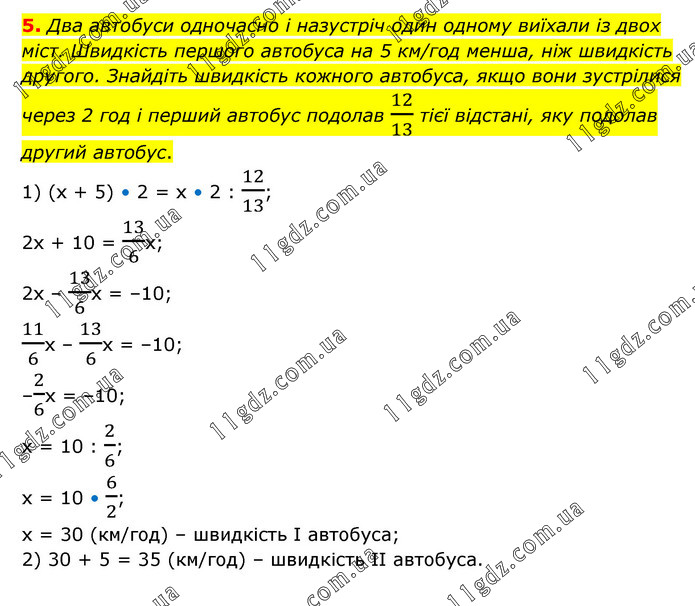 Два автобуси одночасно і назустріч один одному виїхали із двох міст. Швидкість першого автобуса на 5 км/год менша, ніж швидкість другого. Знайдіть швидкість кожного автобуса, якщо вони зустрілися через 2 год і перший автобус подолав 12/13 тієї відстані, яку подолав другий автобус. 1) (х + 5) • 2 = х • 2 : 12/13; 2х + 10 = 13/6х; 2х – 13/6х = –10; 11/6х – 13/6х = –10; –2/6х = –10; х = 10 : 2/6; х = 10 • 6/2; х = 30 (км/год) – швидкість І автобуса; 2) 30 + 5 = 35 (км/год) – швидкість ІІ автобуса.